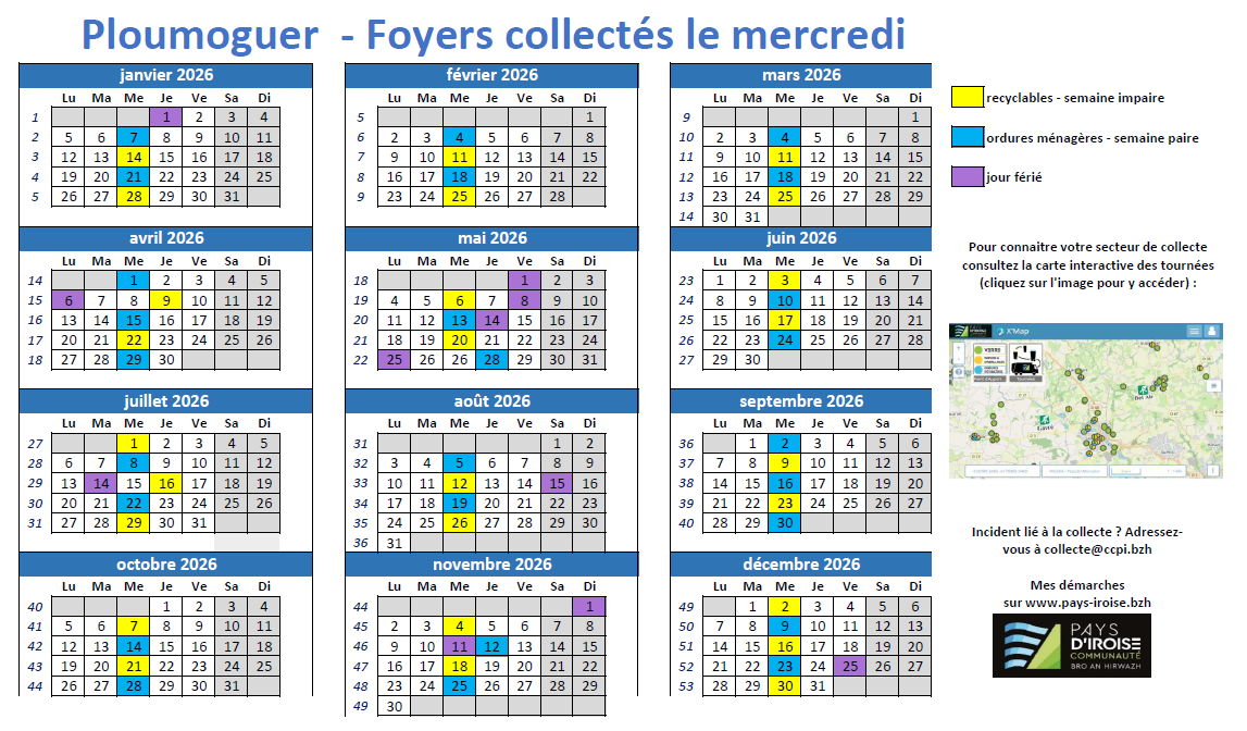 Le calendrier de collecte des dĂ©chets pour l’annĂ©e 2026 est disponible sur votre application et Ă la mairie de Ploumoguer.
